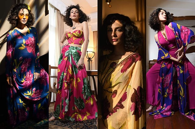 The collection has a lot of bright vibrant colours, our signature big floral prints, and a mix of various silhouettes like draped skirts, corsets, sarees, co-ords, and overlays.