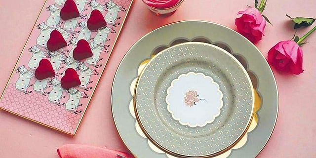 A glamorous Valentine’s Day celebration is all about setting the perfect table—whether you’re celebrating with the girls for that ultimate Galentine’s Day soiree or treating your Valentine to an intimate dinner for two. Which is why Kaunteya has unveiled a romantic table setting using its bespoke Pichwai tableware collection, styled with fresh pink roses and flowers, heart-shaped chocolates and pink napkins.