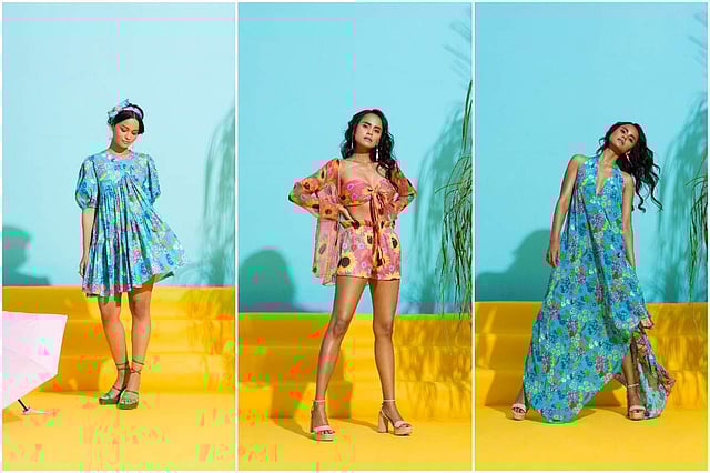 “Our current collection finds an epiphany in the breathtaking blossoms of spring, where the fresh hues perfectly harmonise to make the season come alive. It consists of eclectic prints, exquisite fabrics, dramatic silhouettes, high slits, charming necklines, dainty frills and artistic creations where glamour and the holiday vibe intersect. The collection is inspired by retro gardens, reminiscent of the ’70s and is different from our other collections in the sense that we’ve replaced our obsession with symmetry and geometry with a bright and playful colour palette in bold floral prints,” explains Nilesh, who worked with an Australian design house as an assistant creative head before launching his label, Nautanky.
