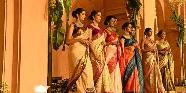 The pastels are soft and bright and lend the smoothness of velvet-like shade to the billowing pallus. The designs were indeed an attempt to create something original; designer Ramya who showcased her temple-inspired bridal collection at the show appreciated Arvind’s work and added, “A unique blend was used, those colours which evoke a sudden delight, in anyone who wears it to anyone who looks at it.”