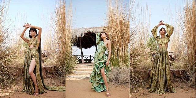 Telling us about the flirtatious theme of the edit, the Jaipur-born designer shares, “We have always tried to experiment with our collections. This time, we wanted to work on a collection which is shimmery and glamourous while we stick to our signature floral prints. We wanted the creations to elevate a sense of luxury lifestyle.” The designer, known for rolling out show-stopping collections worn by celebrities like Madhuri Dixit, Tara Sutaria, Jacqueline Fernandez and Shamita Shetty, brings on the oomph factor with oodles of glitz and glamour in this edit rendered by edgy cuts, botanical prints and swathes of gold colour. She dishes out some statement pieces like a pleated slit sari dress in lurex chiffon, a blazer short set paired with sequin gold bralette in tissue silk, a V-neck pleated dress in chiffon, one shoulder frilled asymmetric dresses and more that get one outdoorsy.