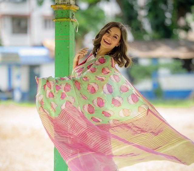 I try to make saris that can be repeated and can be draped from morning till evening. That way a single sari can work as an office wear as well as an evening wear for any occasion. Pricing is also important. Sustainable is not expensive, hopefully I have been able to break that myth. If someone has bought a plain sari from Dora and wants to come back and get a print done on it from our collection, that is also something I do.
