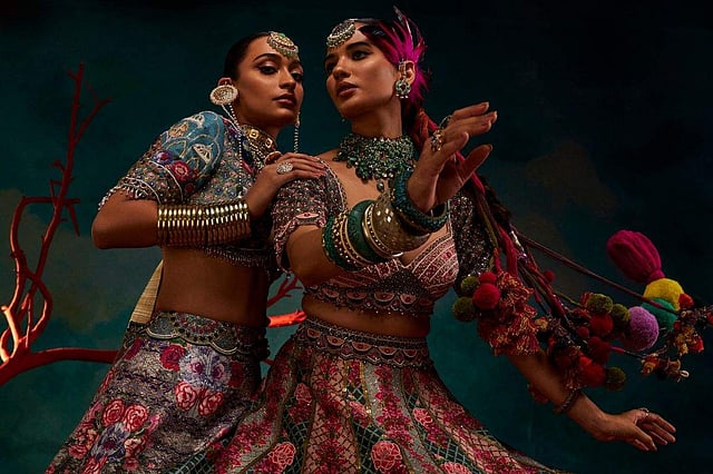 Discussing the collection in detail, the designer says that Devi is comprised of hand-embroidered couture lehengas and saris, offering a diverse spectrum of colours. Departing from the pastels associated with femininity, the collection embraces strong, vibrant jewel tones — emerald green, deep blues, vivacious pinks, and mustards. These colours, feminine yet powerful and dynamic, reflect the vibrance of womanhood.