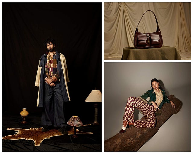 Focusing on details, one can come across ’60s style pants with stamp check print, horse and on overcoats; jackets covered in floral, high tea, mix pattern, signature miniature and green rock prints; and vintage shirts carrying the label’s trail and mustard checks print. Shop for statement pieces like free size printed blazers with drawstrings in front, quilted front open signature dale print jackets, blazers crafted in maroon wool (featuring contrasting running stitches, flora and fauna), tan chequered Madrid Jacket and straight fit bert skirts. Special mentions to their Archive Jacket (fashioned using the patchwork technique and quilting detail), Bert Jacket (showcasing folk art hand embroidery) and the Oversized Blazer Set of Two (blazer in toile print with contrasting running stitches details paired with relaxed fit trousers with top stitch details, hand-finished in a straight silhouette).Beyond chic ensembles, the edit also features accessories like the Monique Shoulder Bag (structured bag handcrafted in leather and detailed with a snap button front strap, single zip closure, two front pockets and hand-block printed cotton lining); Pleated Tote (oversized carry-all leather bag finished with delicate pleats and lined with floral printed cotton) and Phone Sling (a leather sling designed with a single pocket and a top flap opening); in hues like tan, green, black and cherry.