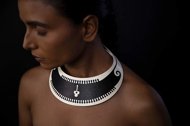 Inspired by Indian tribal design sensibilities, key silhouettes like the hasli (neck ring), the muthia (wrist cuff) and the mandliya (string necklace) have been redesigned for the audiences of today. Beautiful traditional motifs have been reimagined and crafted into stunning pieces of jewellery, using state-of-the-art technology to offer unmatched quality and finish. In an innovative twist, faux leather and enamel have been used together, to bring these first-of-their-kind pieces to life. One can choose from their range of earrings, bangles, cuffs, rings, and long and short necklaces. The pieces are available in black, bottle green, tan, burgundy, teal etc.
