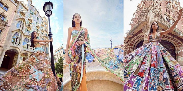 Telling us about it, Aisha shares, “It all started with a serendipitous wedding invitation from an ex-classmate from IED Barcelona. I decided to take this opportunity to revisit my fascination with Catalan Modernism which began during my college days. The wedding became my motivation to go to Barcelona and soon, the trip turned into the genesis of a campaign shoot I’ve always dreamt of doing.” For the unversed, Catalan Modernism refers to a cultural movement that spanned across decorative and fine art, architecture, literature and society where it was a way of expressing re-vindication of Catalan identity — a community in Spain. “While designing this collection, I looked at the works of some of the greatest exponents of Catalan Modernism — Antoni Gaudí and Josep Maria Jujol. Their work exhibited brilliant use of colour and intricately executed mosaics — much like what we do at our label. While researching, the colour connection between Spain and India became more pronounced and this fusion laid the foundation of the collection this year,” Aisha informs us.