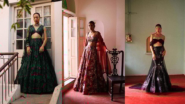The edit is a treasure trove of 60 meticulously handcrafted couture pieces suited for celebrations and momentous occasions. One cannot help but be enthralled by the ivory lehenga, where a halter neck top adorns the regal ensemble, exuding a sense of refined elegance. The fishtail lehenga, accompanied by a strapless bodice, epitomises modern sophistication. And behold the pale pink gown, its ethereal beauty enhanced by exquisite 3-D embroidery, transforming the wearer into a living work of art. For those seeking a touch of shimmer and sparkle, the collection offers resplendent options, such as a bling-on lehenga with sequin work.