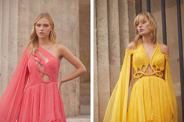 The edit primarily features silhouettes like sheath dresses with trails, mermaid dresses, asymmetric free-flowing drapes and A-line drapes. Precisely, it includes hourglass lines in fluid chiffon gowns, with creative cut-outs and braided detailing. Off-shoulder flowy gowns with a jewelled or embellished bodice and corsets with side cut-outs have also been incorporated into the collection. Silk satin has been luxuriously used for creating the flow through empire line draped gowns and asymmetrical shift dresses. Knitted or crocheted motifs form dreamy aesthetics catering to the sensibilities of the modern woman. Apart from these fabrics, satin georgette and tulle have also been used to create some pieces. The colour palette used in the collection also exudes a classy spunk. “T he palette can be defined as a burst of striking colours ranging from aqua and green to tangerine and yellow. The original essence of the pastel palette we normally do was tweaked into fun, pop colours,” Supria explains.
