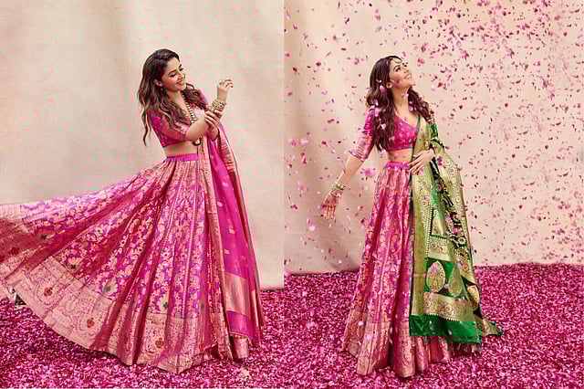 There’s a notable evolution, marked by a shift towards a more eclectic and individualistic approach to style. Unlike in the past, when fashion houses largely dictated trends, contemporary fashionistas are increasingly embracing diversity and personal expression through a preference for colours and designs. We have noticed Rani pink and emerald to be the top choices for this wedding season. They are also increasingly drawn to the timeless elegance of Benarasi handloom saris and outfits which signals not just a change in fashion choices but a broader embrace of sustainable and culturally rooted attires.