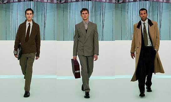 The edit is rich in structured fabrics and sharp silhouettes, with emphasis on a clean look. Visible buttons and zips are removed from their typical placements. Its muted colour palette draws from the neutral hues commonly seen in the corporate workplace, ranging from timeless gray and white to shades of brown and green. In accessories, playful references to office objects like paper clips, pens, and folders have been reworked. Details like numerical locks on briefcases lend a statement finish to accessories like bags and shoes.