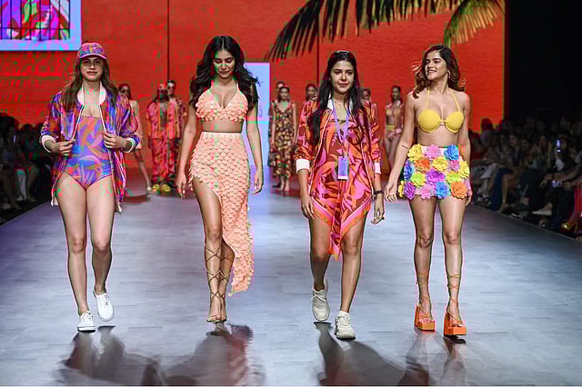 Designer Reby Jindal tells us that men’s beach wear also offers printed resort shirts, shorts, lungis, tees, and robes. Adding more excitement to the peppy, perky collection were three chirpy influencers – Radhika Seth, Meghna Kaur and Malvika Sitlani dressed in a variety of swimwear, shorts, sexy fitted skirts, and bralettes.