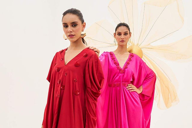 Describing a few of the standout pieces from the collection, Esha tells us, “The spiced pear kaftan and rosewood mosaic co-ord set seamlessly blend mirror embroidery with festive charm. They are crafted from luxurious jewel-toned satin by skilled artisans.” On the other hand, she says, is the rubyetta embroidered tunic set that embodies a fusion of luxury, modern design, and intricate embellishments. It celebrates opulent silk-blend satin, contemporary style, and meticulous detailing, resulting in a striking ensemble.