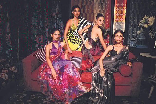 The Kyoto-Delhi: Non-Stop serves as a dreamy collection that is a crossover between India and Japan. The beautiful assortment of playful saris, co-ord sets, shirts and dresses reflects inspiration from the art of Japanese woodblocks, the traditional patchwork style of Boro, a serene Japanese garden; a memory from the unforgettable Sakura season and the Japanese counterculture — yakuza tattoos’ striking prints that sit on the body like a second skin.
