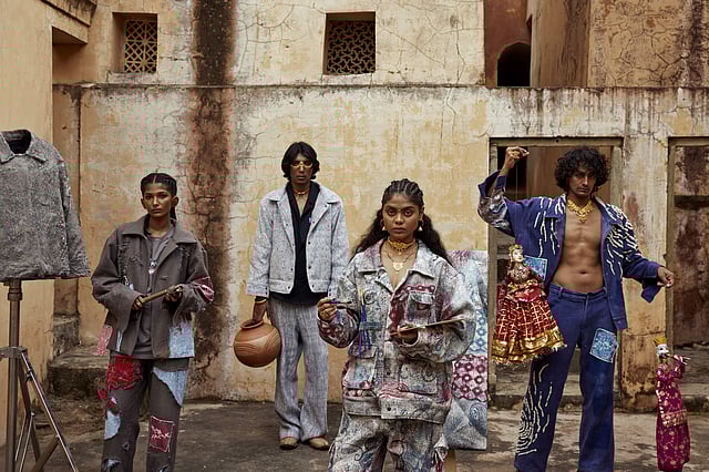 “The Mumtaz jacket depicts the irony of Shah Jahan and Mumtaz’s love story, where he built the Taj Mahal for her, a sight unseen by the very person it was built for,” he elaborates. Detailed with patches, this limited-edition piece includes a hand-embroidered flower symbolising love on the back and a blue patch reminiscent of the Taj Mahal’s silhouette, the jacket is a testament to the enduring love story of Shah Jahan and Mumtaz. This gender-inclusive, drop shoulder-oversized jacket also features hand-screen printed elements and digital patches while the Upcycled Indigo HandwovenJacket fashioned from wasted fabrics. The organic dyed Indigo jacket, cut into thin stripes, is designed from discarded textiles that are handspun and hand-woven yielding just two metres of fabric in a single day.