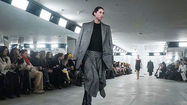 Once the runway show began, the crowd was treated to an assortment of tweed jackets, double-breasted coats, slit skirts, and sequined dresses. There were cashmere turtleneck sweaters, thick eyewear, and slender bags. With a few exceptions, the majority of designs employed a neutral colour palette, with some grey, and lots of blacks.