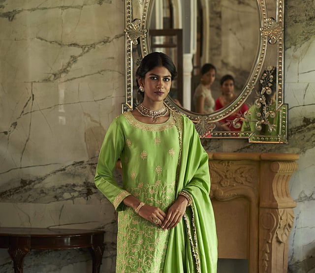 Her newly launched festive collection, Kamal Ratan, too, showcases an amalgamation of exquisite craft that resonates with the vivid emotions surrounding Indian weddings. From kurtas to saris and kaftans, the ensembles come in a vivid color palette ranging from ivory, orange, gulabi, and crimson, to firoza blue, lilac, aqua blue, lime green and more. Neha lets us know more about the edit.
