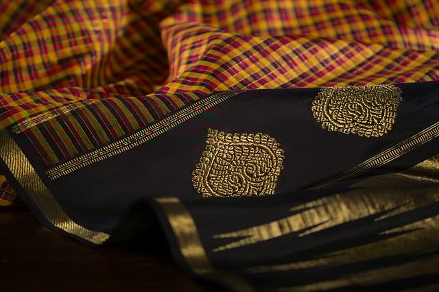 The collection features vibrant coloured blocks inspired by the classic Madras Check, as well as stunning gold checkerboard checks that frame woven motifs. Additionally, it showcases fine gingham or muthu kattam. Keep an eye out for broad colour band stripes adorning the pallu or body of the silk, along with delicate metallic and silken pinstripes. This assortment of kanjivarams exemplifies the diverse yarns and zari in both the warp and weft of the sari, resulting in the beautiful expressions of kattam and vari on the kanjivaram drape. The straightforward notion of checks and stripes has undergone a distinctive transformation at the hands of skilled weavers, who have seamlessly incorporated vibrant colours and unique patterns into the assertive geometry of the fabric.