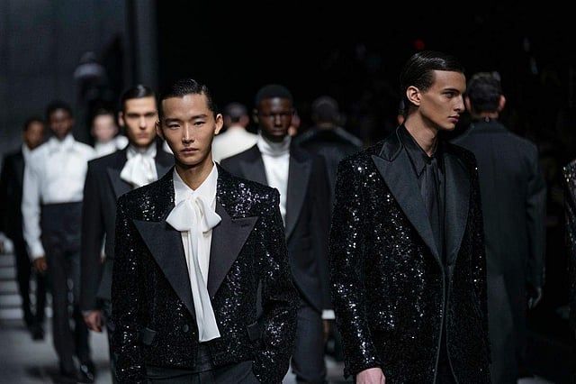 Silken shirts and shorts featured digital prints made from Google AI technology, which is speeding creative impulses. The collection also marked the sometimes impatient passage to adulthood, from streetwear to formal wear via knitwear briefs and matching hoodies woven with silver tinsel, striped tops gleaming with clear sequins under suits and a casual suit jacket over a graphic shirt and jeans.
