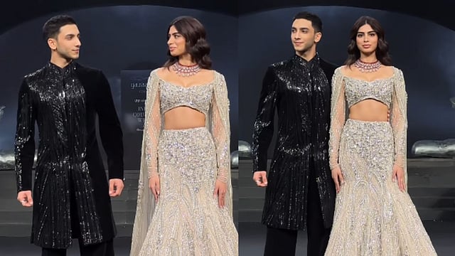 Vedang, on the other hand, exuded sophistication in a tailored black sherwani embellished with shimmering black beadwork. His ensemble, paired with black trousers and brogues, created a striking contrast to Khushi’s silver ensemble.