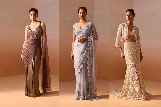 “The motifs used in Mehr are largely florals so as to express and resonate with nature’s abundance. It has a softness and mystical appeal like a world waiting for the sun’s rays to unveil a new day. Our earlier spring-summer collection Bahaar was evocative of the full bloom of summer, while Mehr is more restrained and teasing in contrast,” Nitika tells us, adding, “Like the early morning mist that hits at the impending dawn, Mehr has a lot of dreamy silhouettes that indicate the gradual stirring from a restful slumber to wakefulness.” It is a collection of celebration wear; comprising elements that suggest freshness, and the diverse colour palette and silhouettes allow one to pick outfits for every occasion and time of the day. “In keeping with the light and airy feel of the collection, accessorising needs to be minimalistic. Beaded clutches, headbands and wispy veils would work very well with these outfits,” the designer adds.