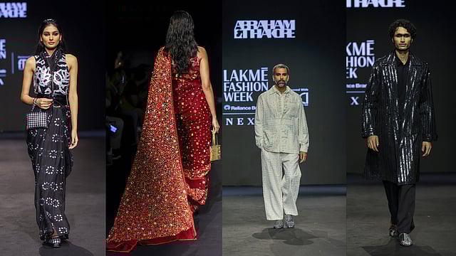 Celebrated for their minimalistic chic designs and known for their ‘fabric first’ philosophy, David Abraham and Rakesh Thakore’s feted label Abraham & Thakore’s Spring-Summer’25 collection, Finding Beauty, unveiled recently at LFW x FDCI, leaves an indelible mark for its thrust on sustainability. The range delves into the forgotten, the cast-off, and the disregarded through a collection of luxuriant evening wear that uses discarded materials that are normally left behind in our rapidly moving world to embellish the attires. What’s unique is that this edit reimagines waste as a treasure, profoundly reflecting consumption and value. The dazzling collection in a colour palette comprising white, beige, gold wine red, coffee, and black, makes ingenious use of discarded materials. Everyday Indian ephemera finds like gunny bags, toffee wrappers, bin bags, kitchen foil, and rice sacks finds new interpretation as cement sacks get transformed into stunning evening gowns. You’ll find, sequins laser-cut from discarded X-rays, while the delicious ‘scroop’ of silk, while attributed to plush French dresses of the early 1900s, emerges this time from the rustle of a contemporary knee-length skirt. Memories once trapped in old film reels are expressed on delicate georgettes, while unspooled cassette tapes are intricately woven into organza, forming delicate floral motifs that evoke a sense of nostalgia. Hundreds of discarded chip wrappers, each with its own tale, are stitched together to create striking knee-length dresses. Abraham takes us through the edit.