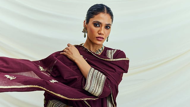 The collection is rich in motifs such as chaand, ambi, and floral designs, all intricately crafted with zari and sequins. These elements draw inspiration from Rajasthan’s artisanal heritage, reflecting a deep appreciation for traditional craftsmanship. The use of solid colours throughout the collection enhances its versatility, allowing wearers to mix and match with accessories to create personalised looks.