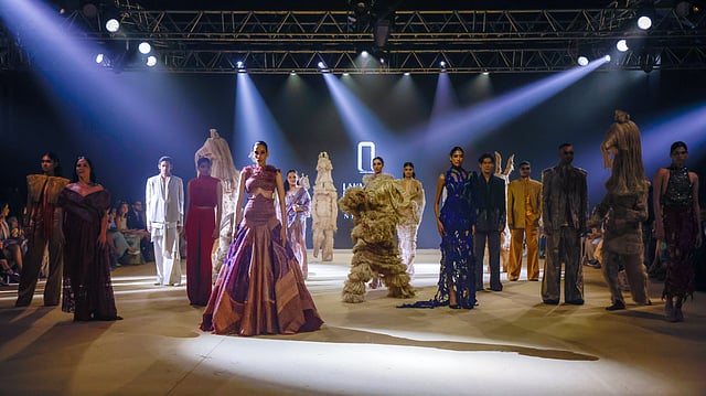 Drawing inspiration from the undulating grasslands and their furrows, designer Abhishek Sharma’s latest edit, Trin, unveiled at the recently held LFWxFDCI event, breathes opulence and earthiness at once. Playing around the whimsy, serenity, and beauty of the extensive Indian grasslands, the collection subtly captures the ever-changing hues of the copious crop fields from dawn to dusk, from mundane to mystic, in a timeless manner. Paying attention to details and surface ornamentation, the silhouettes bring out the rawness of ridges and furrows through metal couching and miscellaneous heat textured fabrics besides raffia, matka silk, linen, silk, net, cotton voile, velvet, and chiffon. A variety of draping techniques, kantha embroidery, 3D hand embroidery and intense beadwork have been employed to emulate natural grasslands in a colour palette ranging from subtle beiges to flaming tangerine and midnight blues. The silhouettes include structured jackets, gowns with bold creative cuts, and asymmetrical furry winter drapes. Abhishek talks about Trin and more.