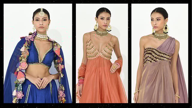 Among the standout pieces is a jewelled bralette paired with a fishtail skirt and an iconic cape set—a stunning example of the collection’s intricate detailing and bold design.