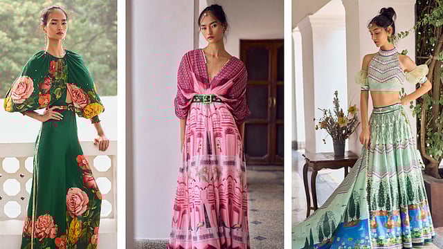 The result? A collection adorned with opulent floral motifs that echo the grandeur of historical artworks, now translated into a fashion-forward context. The navy blue-fuchsia and teal-ivory print stories are a particular nod to the Chandra Mahal and the Tree of Life, combining tradition with contemporary flair in a way that’s nothing short of mesmerising.