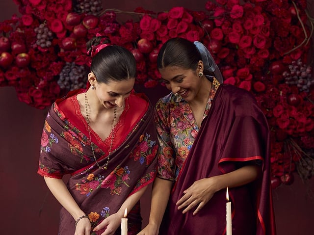 The collection features luxurious handwoven silk saris with intricate jamdani weaves, vibrant floral prints, and multicoloured patterns, perfect for festive occasions, weddings, and cocktail parties. Swati shares, “We’ve also designed kurta sets in pure handwoven mulberry silk and silk satin, offering a rich, soft feel that’s perfect for brunches or family events, combining comfort and elegance.” The edit is further enhanced by handmade details like tatting flowers, beaded embellishments, and intricate scallop cutwork embroidery, adding a unique touch to each piece.