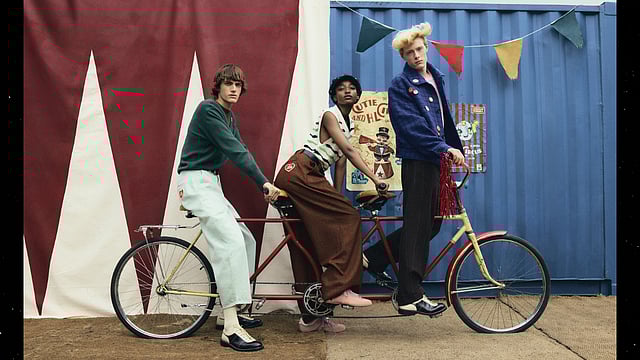Expect to see polka-dot shirts paired with quirky ties, oversized tartan outerwear, and retro zip-through Harrington jackets. Each garment encapsulates his meticulous eye for detail and his ability to evoke joy through fashion. The silhouettes playfully reflect the spirit of a circus performer, featuring cropped ringmaster blazers that evoke the charm of fancy dress parties, styled effortlessly with ringer tees. Meanwhile, barrel-leg trousers take inspiration from clown costumes, reimagined in soft pastel corduroy and denim for a contemporary twist.