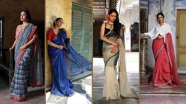There are four different saris, and each of them embodies a specific look — keeping in mind the young generation of Bengal — to inspire them to wear our traditional textiles. So, there’s a white handloom cotton sari for perfect street wear during the daytime, a blue silk sari for any daytime occasion or office events, a discharged block-printed silk for parties or festive occasions and a red polka discharge block print sari worn with a stylish shirt top for cocktail evenings.