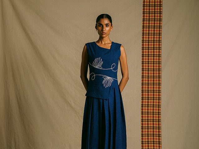 With Madras checks as its core textile, Korvai also incorporates seersucker and open-ended cotton in earthy indigos, browns, and whites. The result is a breathable, versatile wardrobe of everyday pieces — lightweight paavada sets, kavi dresses, and Korvai connect shirts — that remain rooted in cultural identity yet completely wearable.