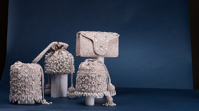 Jadau features a stunning range of handcrafted bags, including potlis, clutches, minaudieres, and structured handbags, ideal for weddings, festive celebrations, cocktail parties, and special events. Designed to hold essentials such as phones, cards, and makeup, these bags remain lightweight and easy to carry. Shipra informs, “With versatile styling options, they come with detachable chains or wristlets, allowing you to wear them as a clutch, sling, or handheld bag.”
