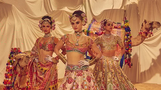 What truly sets this collection apart is its breathtaking campaign shoot. Gazal brings her vision to life with remarkable authenticity, blending traditional textiles, colours, mirrorwork, and striking ethnic silhouettes. Models are seen draped in radiant ensembles, their presence amplified by earthy elements and even camels, creating an atmosphere that feels cinematic.
