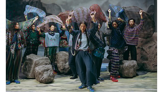 From Kullu’s hand-knits and Afghan refugee artisans’ intricate crochet to Gujarat’s tie-and-dye grids, the tartan vocabulary is expanded with péro’s signature embellishment in beadwork, stumpwork, appliqué, woollen pom-poms, quilting, ruffles, pleating, and even semi-precious stones set into embroidery.