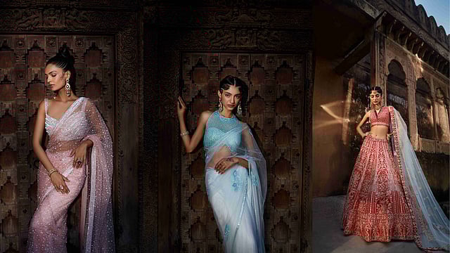 From glittering lehengas to elegant saris, Jiya by Veer Design Studio’s latest wedding collection, Ethereal Dreams, features luxurious fabrics such as raw silk, organza, and chiffon, intricately embellished with zardosi embroidery, resham work, and shimmering crystals. “The colour palette spans from classic bridal reds and deep jewel tones to softer hues like blush pink, champagne, and the trending earthy tone, Mocha Mousse.