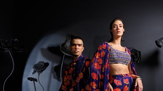 Wings & Bloom features lightweight and flowing fabrics, including organza, silk, and chiffon, which, according to Nilesh, enhance the airy and graceful aesthetics of the garments. He continues, “The colour palette draws from nature’s vibrancy, featuring soft greens, floral reds, vivid oranges, sky blues, and bold black hues with colourful accents.”