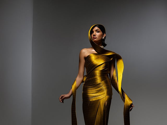 Kinesis is a striking fusion of texture and craftsmanship — picture sculpted wire bodices, ombré metalwork, and layered surfaces, all made to flow and shift with every movement. The colour palette, too, tells its own story. From high-polish silver to molten gold, deep midnight black, and unexpected flashes of red, each hue has been designed to shimmer, shift, and surprise. “These aren’t static colours, they’re kinetic, reflective, and bold. You’ll see a lot of gradient finishes, 3D fringe techniques, and innovative constructions that push the idea of surface movement,” Rimzim adds.