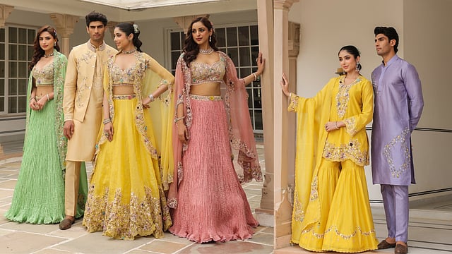Designed for every role in the wedding party, Gulzar offers something for everyone. Brides will find blush-toned lehengas and shararas with timeless detailing, while bridesmaids can opt for flowy anarkalis or lighter lehengas that transition beautifully from day to evening. For guests, there are draped saris and easy kurta sets in floral accents and calming hues like rose madder, mint green, peach, and ivory.