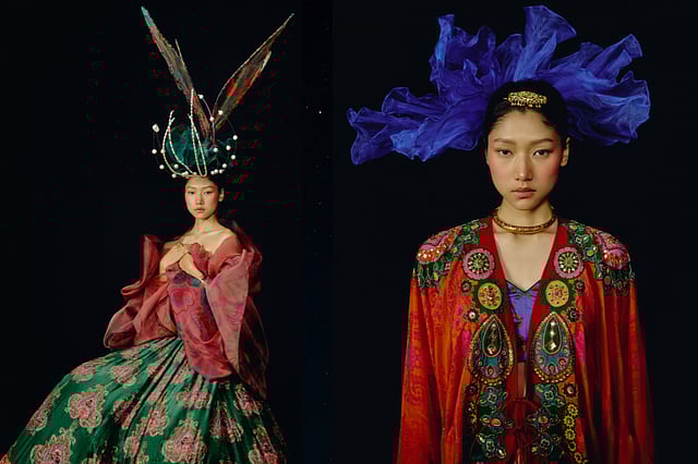 The designs are deeply influenced by Indian and Oriental textiles. The vibrant jewel tones throughout the collection echo the hues of the seven chakras, symbolising balance and spiritual harmony. Each ensemble is a tactile celebration of opulence, enriched with intricate hand-embroideries, gold threadwork, and mirror embellishments. These details add layers of depth to the pieces, while velvet trims sculpt the silhouette, combining light and shadow into one seamless experience.