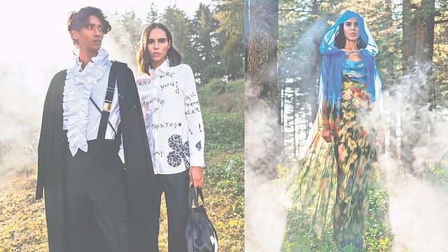 The collection’s prints are a nod to the imaginative worlds of literature and fantasy. Hemant elaborates on the inspiration behind the vibrant motifs, “The clothes are an ode to colouring outside the lines. An Anemone print is a hazy interpretation of larger-than-life flowers, inspired by the talking flowers in Lewis Carroll’s Alice in Wonderland.” This whimsical garden theme is also reflected in the distorted garden print, which captures a dream-like quality—vague yet striking in its execution. The prints evoke the sense of a fleeting, almost surreal moment stolen from a dream.