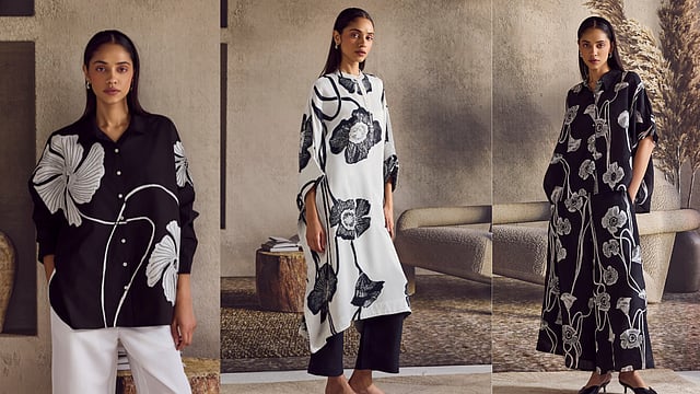The colour palette, composed of soft monochromes, serene neutrals, and midnight tones, enhances the collection’s meditative charm. “Each piece carries an intentional irregularity—whether it’s a stitch, drape, or fold—making the garment feel less manufactured and more soulful,” Manjula shares.