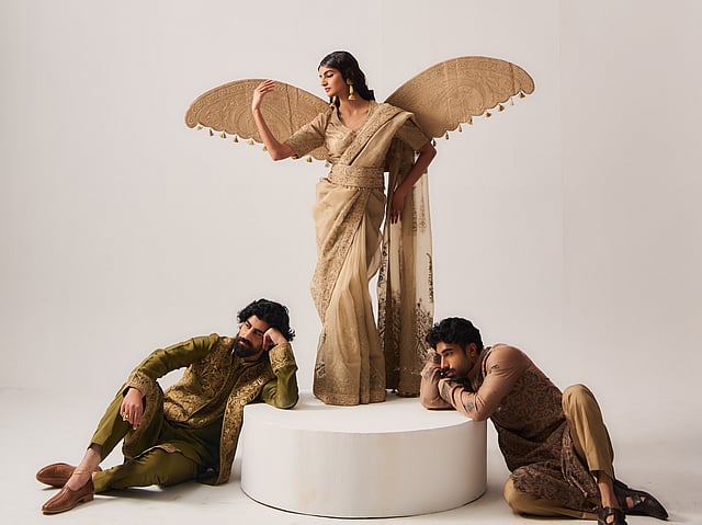 The campaign shoot for the collection brought the idea of prosperity to life in a studio setting. With lighting, props and textures, the team recreated the atmosphere of a lush garden. “One striking frame featured a model with wings, celebrating a celestial spirit,” says Anshum. “It was a nod to joy, harmony and the ethereal beauty that echoes through the collection.”