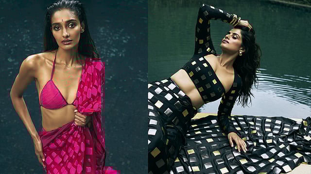 The idea was to reimagine the iconic rain sari for today’s woman. The collection takes the emotion and drama of Bollywood and turns it into a modern, confident, and glamorous mood. This edit brings a stronger cinematic feeling. Faux leather is used more softly and expressively with ombré and glossy finishes. The draping also feels more fluid and focused on movement and ease.