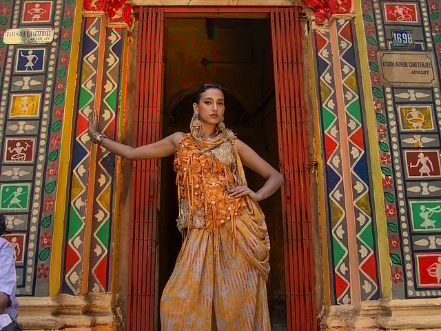 The designer has also connected Art Deco with Kolkata. Explaining the same, he says, “Kolkata’s landscape is unique because neoclassical facades, traditional Bengali courtyard houses, and Art Deco buildings from the post-independence era all sit side by side. that tension and layering is what inspires me. Art Deco’s geometry finds a place in our linear designs and silhouettes, while Bengali elements like the khorkhori janala louvered windows, dhotis, and saris are reinterpreted into modern forms,” he adds.