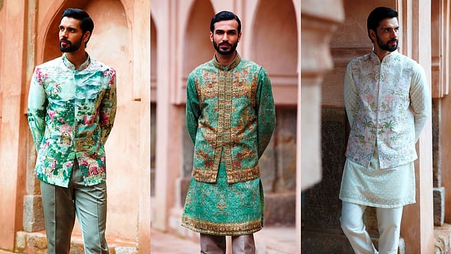 We’ve opted for a balance between vibrancy and subtlety. The printed bandhgalas feature lively, tropical colours, while our indo-westerns and kurtas lean towards earthy pastels. Sherwanis incorporate classic beige and gold.