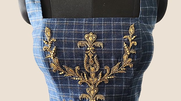 Among the edit, the Noor-e-Kaftan in deep black bandhani silk finished with embroidery, a crystal brooch and cabaret-inspired fringes; The Chancellor Set pairs ivory taffeta with a cropped silver brocade jacket; Kumari in khadi with reimagined in sculpted sleeves, a cinched waist and a checkered bow; and the Sovereign Corset in navy tartan overlaid with antique gold zari and beadwork stand out the most! “The colour palette boasts rust, charcoal, ivory, deep navy and bursts of saffron and beetroot pink. We intentionally kept the palette grounded to let the textures and embroidery do the talking,” she signs off.