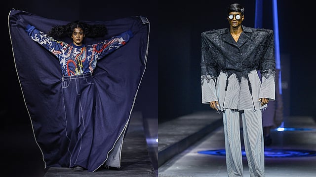 The colour palette moves through earth-derived tones like charcoal, burnt umber, muted ivory, and deep indigo, punctuated with controlled accents of rust and oxidised reds. The garments are built through layering, modular panels, and asymmetrical construction, allowing the silhouettes to shift with movement. There is a deliberate interplay between structured tailoring and fluid draping. Textures play a significant role. Matte surfaces are contrasted with subtle sheens, and raw edges against refined finishes, creating a tactile dialogue within each piece. The fabrics are primarily natural fibres enhanced through technological processes, giving them both resilience and an unexpected hand feel.