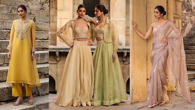 Translucent silk, chanderi checks, organza, and fluid silk weaves form the base. They are breathable, summer-conscious, and tailored to Indian climates. The palette stays restrained: sky blue, blush pink, buttercream, sage.
